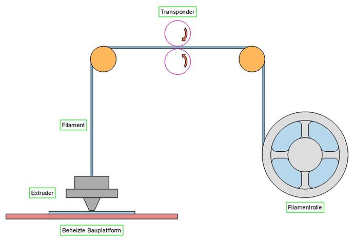 Der Materialauftrag erfolgt durch Extrudieren mit einer in der Fertigungsebene frei verfahrbaren Heizdüse (Extruder).